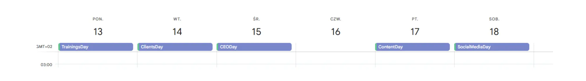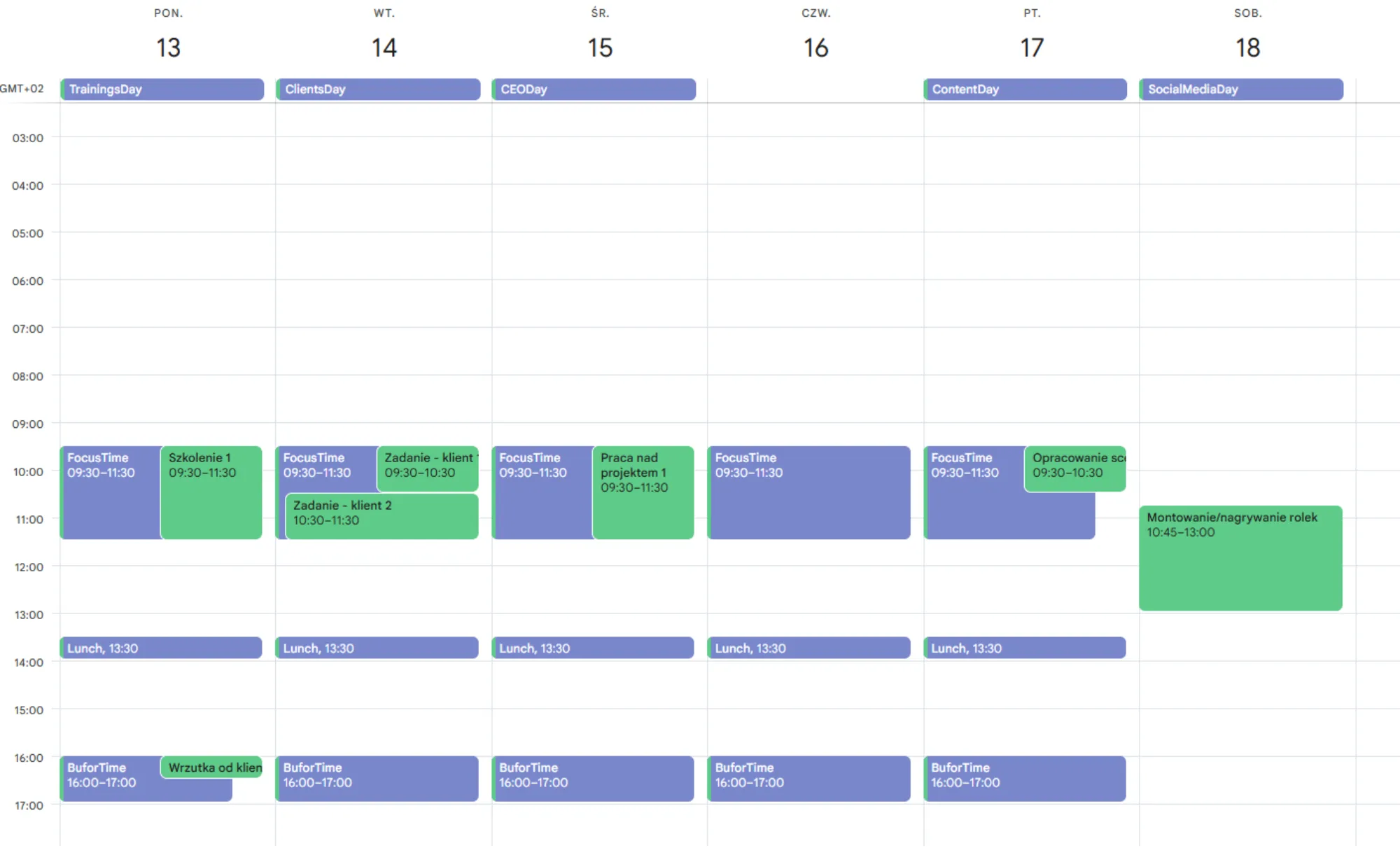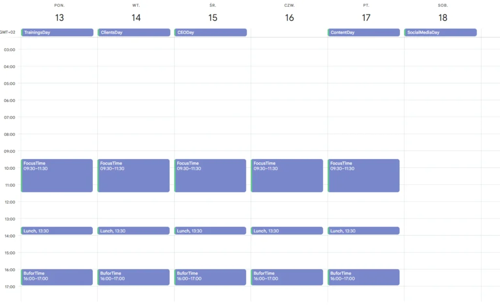Każdy dzień w moim kalendarzu (a właściwie większość dni 😉) ma przypisany obszar, nad którym pracuję. Dzięki temu żaden ważny temat nie zostaje wiecznie odkładany “na póżniej”.