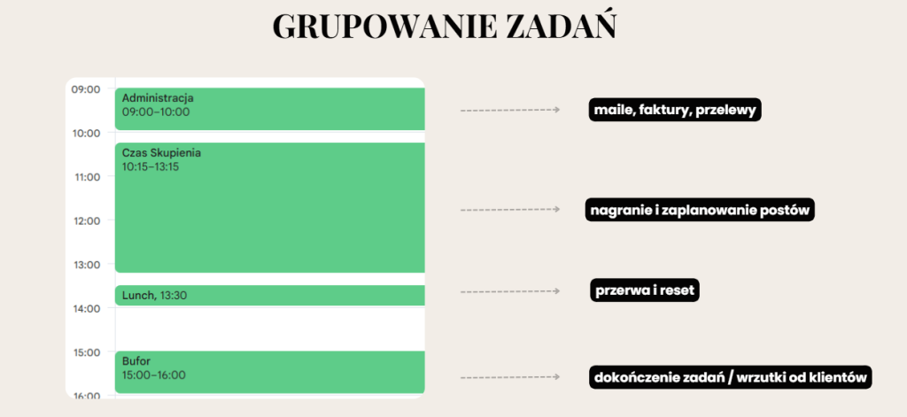 Gdy grupujesz zadania, pracujesz nad nimi w jednym ciągu, co zwiększa świadomość tego, na co faktycznie przeznaczasz swój czas.